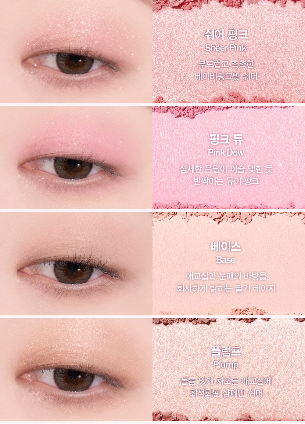 01 웜 애교 스플릿, 02 쿨 애교 스플릿은 쉬머&글리터 타입의 5mm 스틱 아이섀도우가 내장되어 있으며, 03 웜 셰이드 오픈 티어와 04 쿨 셰이드 스플릿은 펄이 없는 컬러의 5mm 스틱 아이섀도우가 내장되어 있습니다. 반대편에는 4개 모두 펄리스 브라운 톤의 3mm 두께 슬릿 라이너가 적용되어 있습니다.