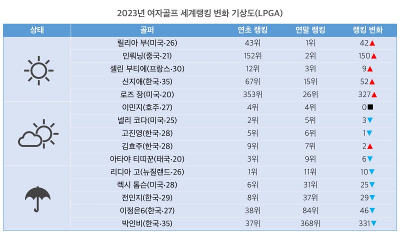 한편, 고진영은 지난 7개 대회에서 준우승 2번, 6위와 8위 1번을 기록했지만, 1번 탈락, 2번 30위권 밖으로 밀려나는 등 극심한 부침을 보였다. 유해란의 상승세는 눈에 띄지만, 최근 LPGA 투어 한국 여자골프의 하락세는 한국 여자골프가 세계랭킹에서 직면한 위기를 실감케 한다. 고진영이 상황 반전에 실패하면 최악의 경우 세계랭킹 10위권에는 단 한 명만 남을 수도 있다는 불안한 예감이 든다. 지난주 10위였던 양희영은 이번주 11위로 한 계단 밀려났지만 다시 ‘톱10’ 복귀는 쉽지 않을 전망이다. 또한 김효주는 한 계단 상승한 18위로 예상되나, 최근 활약상을 고려하면 당분간 ‘톱10’ 진입은 어려울 것으로 보인다. 신지애의 순위도 꾸준히 하락세를 보이고 있다. 이번 주에는 두 계단 하락한 27위를 기록했습니다.