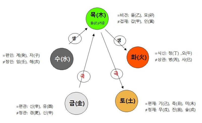 그러나 일반적으로 예로부터 남자의 갑주(甲乙)와 여자의 오행(壬癸)이 지구를 수혜자로 삼았기 때문에 땅이 많지만 역시 지지의 흙이다. (지리). (土)의 경우 운에 따라 색이 쉽게 변한다.