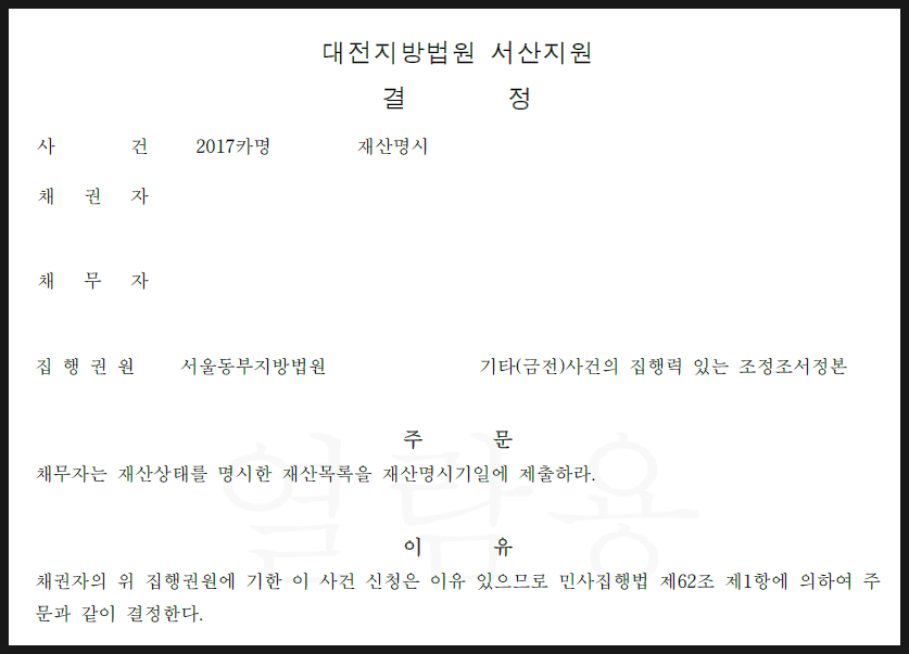 신청이 채무자의 주소지 지방법원에 접수된 경우 법원은 신청이 타당할 때 재산 지정 명령을 내립니다. 명령은 채권자와 채무자 모두에게 송달되어야 합니다. 채무자가 이의를 제기하지 않는 경우 법원은 채무자가 법정에 출두하도록 요구할 날짜를 지정해야 합니다. 채무자는 지정된 날짜에 법정에 출두하여 재산 목록을 제시하고 목록의 내용이 사실임을 맹세해야 합니다.