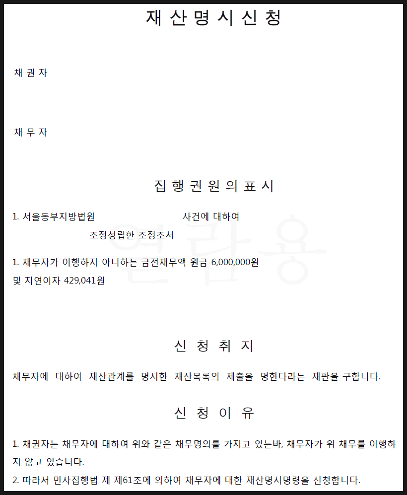 통화채무를 지고 있는 채무자가 채무를 이행하지 않을 때 이행해야 할 재산과 처분을 명시한 재산목록을 법원에 제출해 줄 것을 법원에 요청하는 절차를 말한다.