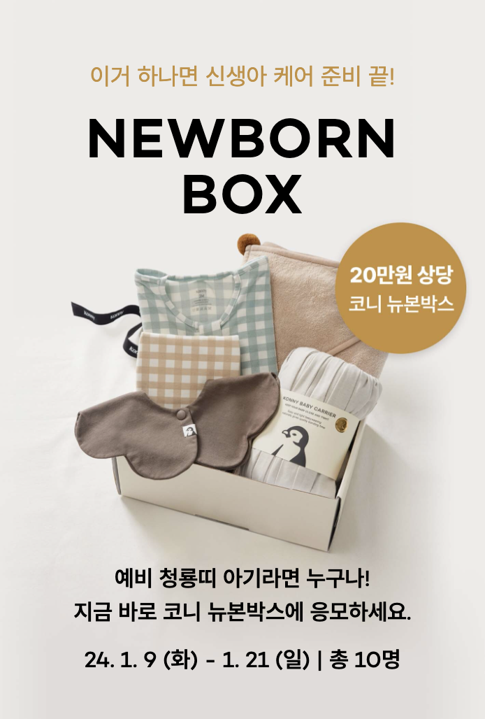 코니코니│코니부모님의 삶을 더 편하고 좋게 만들어드립니다.pf.kakao.com 3. 신청서 작성 후 이벤트 공유하기 코니 신생아박스 신생아 돌보기 준비물 이것만 있으면 끝! 신생아 BOX 청룡해에 태어난 모든 아기! 지금 바로 코니 신생아박스를 신청하세요. 24. 1. 9(화) ~ 1. 21(일) | 신생아 키우기에 자신감을 더해주는 총 10가지 구성 BEST&NEW 코니 신생아 컬렉션 총 20만원 상당의 제품 구성 구성 1 신생아 대나무 스와들파우치 NEW 구성 2 신생아 모달 스와들수트 NEW 구성 3 코니지밴드 플렉스 구성 4 코니턱받이 구성 5 이지바스 신생아타올 1/23 출시 예정 신제품 신생아 대나무 포대기 0~3개월 엄마의 배와 꼭 닮은 파우치 타입… konny.co.kr