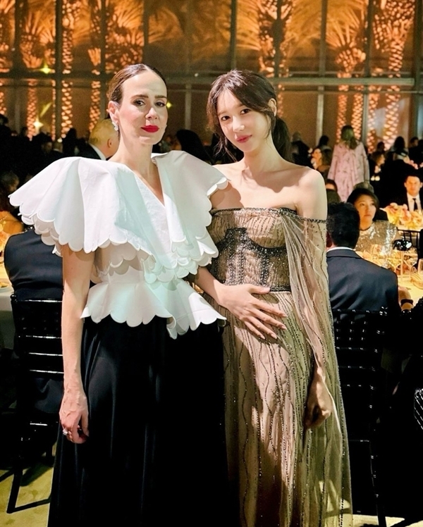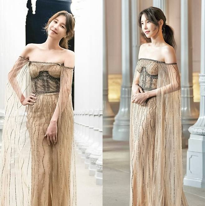 이지아가 선택한 드레스는 클래식하면서도 고혹적인 베이지 톤에 매끈한 네크라인과 도드라진 쇄골 라인이 강조된 오프숄더 스타일이었다. 이지아 특유의 세련된 외모와 고급스러운 미모가 돋보이며 현장의 모든 시선을 압도하기에 충분했다. 이지아는 자연스러운 헤어스타일과 미니멀한 액세서리로 전체적인 룩의 완성도를 높였다.